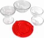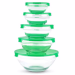5-piece glass bowl set with airtight lids for mixing, serving, and storing. Durable, space-saving, and BPA-free—perfect for everyday kitchen use.
