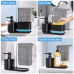 With its practical design, this soap dispenser set fits perfectly in kitchens, bathrooms, or any sink area. The sponge holder keeps your scrubbers organized, while the towel holder keeps cloths within reach.